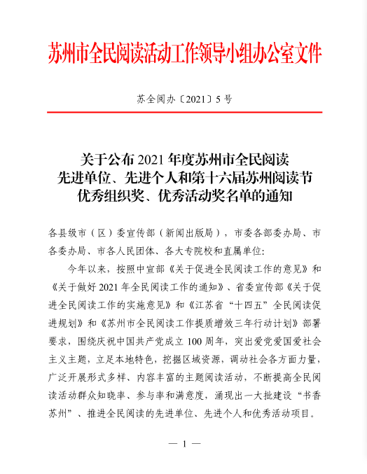 在近期开展的2021年度苏州市全民阅读先进单位、先进个人和第十六届苏州阅读节优秀组织奖、优秀活动奖评选中,我校再获“全民阅读先进单位”荣誉称号。