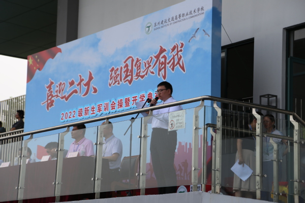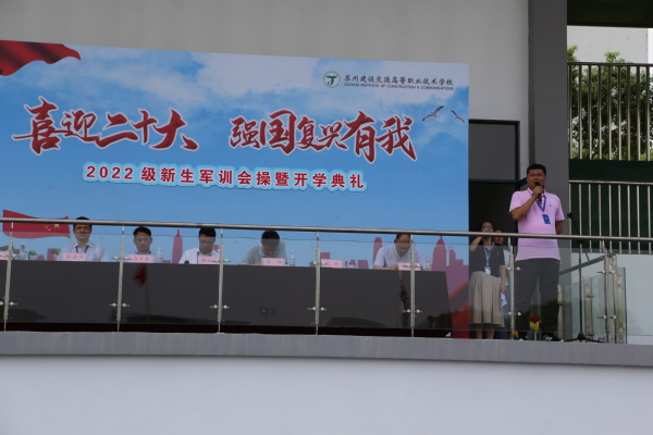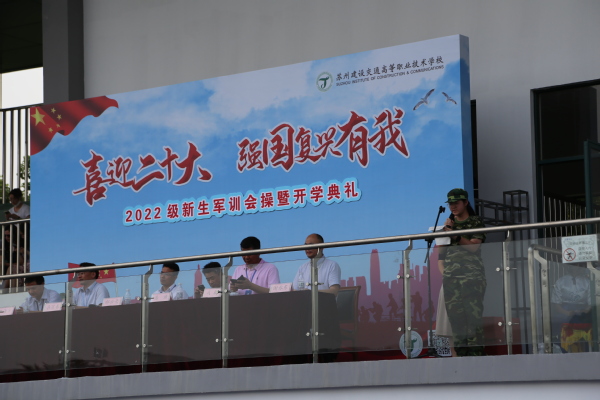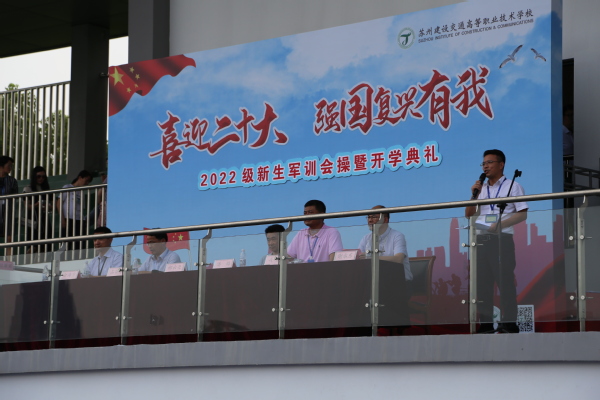 9月17日下午,在教育园校区举行苏州建设交通高等职业技术学校2022级新生军训会操暨开学典礼。校党委书记校长郝云亮、校党委副书记占百春、副校长潘澔、副校长俞海方、副校长戎成、副校长谢永东,各系部、处室负责人及新生班班主任出席大会。