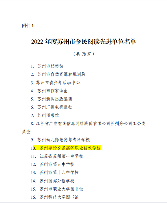 我校获得2022年度苏州市全民阅读先进单位,这是我校第六次蝉联此项殊荣。2022年度,我校全体师生围绕迎接党的二十大胜利召开,突出深入学习贯彻党的二十大精神主题,全面学习贯彻习总书记致首届全民阅读大会贺信精神,立足苏州特色,健全学校阅读机制,持续完善阅读设施,创新阅读形式,广泛开展形式多样、内容丰富的主题阅读活动,取得了良好的示范效应,进一步助推我校高质量发展。(图/文 汪丽丽)