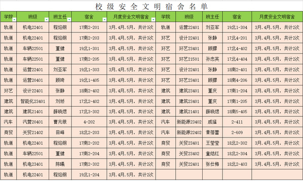 在2023-2024学年度第二学期的校级“安全文明宿舍”的评比活动中,学院和班级积极响应,踊跃参与。“校级安全文明宿舍”评比每学期一次,每月评比月度安全文明宿舍,累计评分靠前的宿舍将获得学期 “校级安全文明宿舍”。