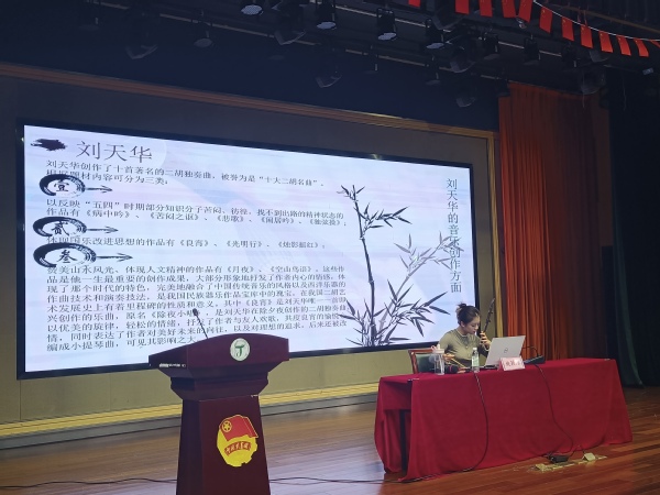 二胡是中国传统的民族乐器之一,有着悠久的历史和独特的艺术魅力。本次讲座,姚老师主要从二胡的历史沿革、二胡的基本构造、二胡的演奏技巧、二胡的传承保护、二胡的名人名曲几个方面开展。讲座刚开始,苏州歌舞剧院姚老师对二胡的历史沿革进行介绍,她引用耳熟能详的诗句,让学生感受二胡那悠久的历史。接着,姚老师用实物和图片的结合方式对二胡的组织构造进行讲解;然后,讲解中国近现代音乐史代表人物刘天华的突出贡献,并现场播放了名曲《万马奔腾》《江南纯色》等。姚老师还给全体学生带来几曲精彩的独奏表演,学生们在悠扬的曲调中,切身感受到了传统文化的耀人光彩。