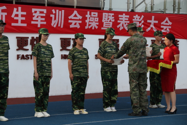接着进行的是军训先进表彰。在本次军训活动中,涌现出31位优秀教官、122位军训先进个人和18个先进班集体。学校副校长潘澔、教官张伟、副校长谢永东分别为优秀教官、军训先进个人代表和先进班集体代表颁奖。